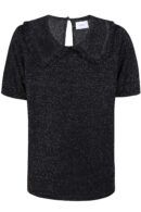 En mega lækker t-shirt fra D-XEL. Her kommer den i en sort farve med lækre glimmer detaljer. Stor krave med frynser, den lukkes med en knap i nakken.