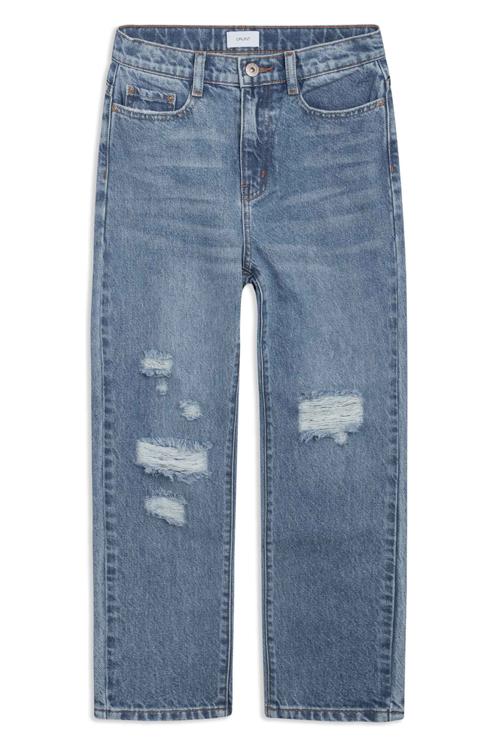 Super fede jeans fra Grunt i blå. Bukserne har brede ben og 5 lommer. Kommer her med slidte detaljer og er fremstillet i blød bomuld.