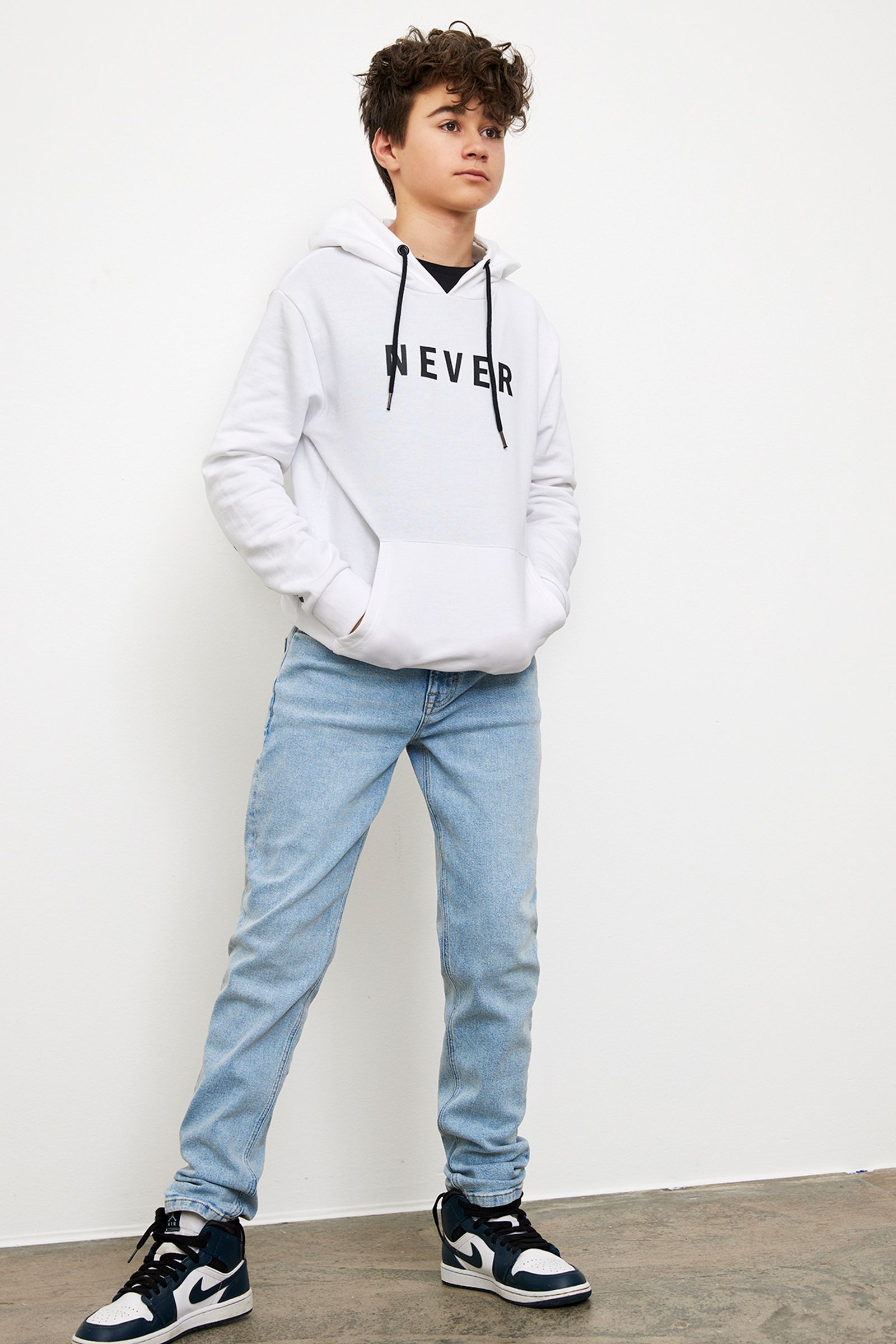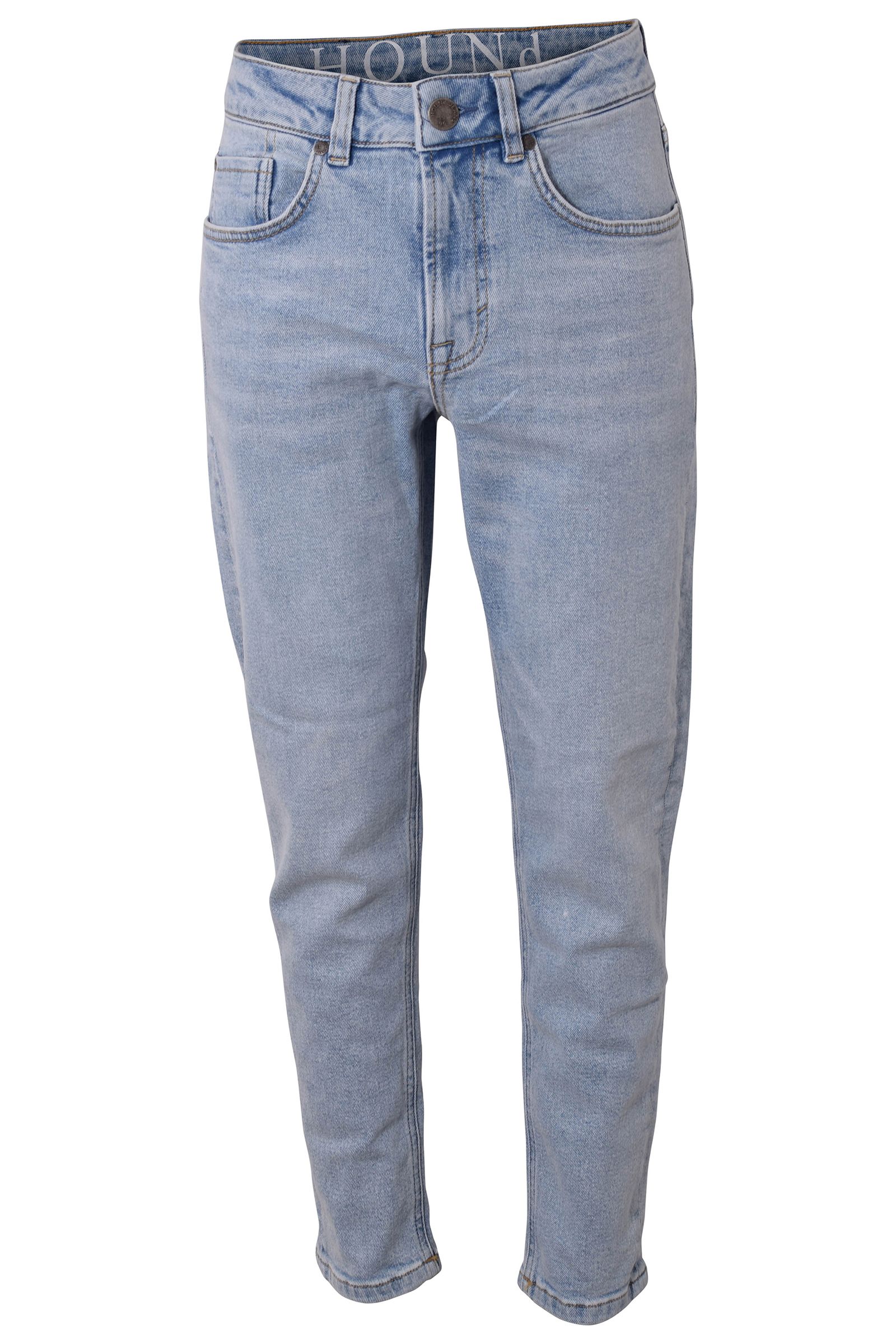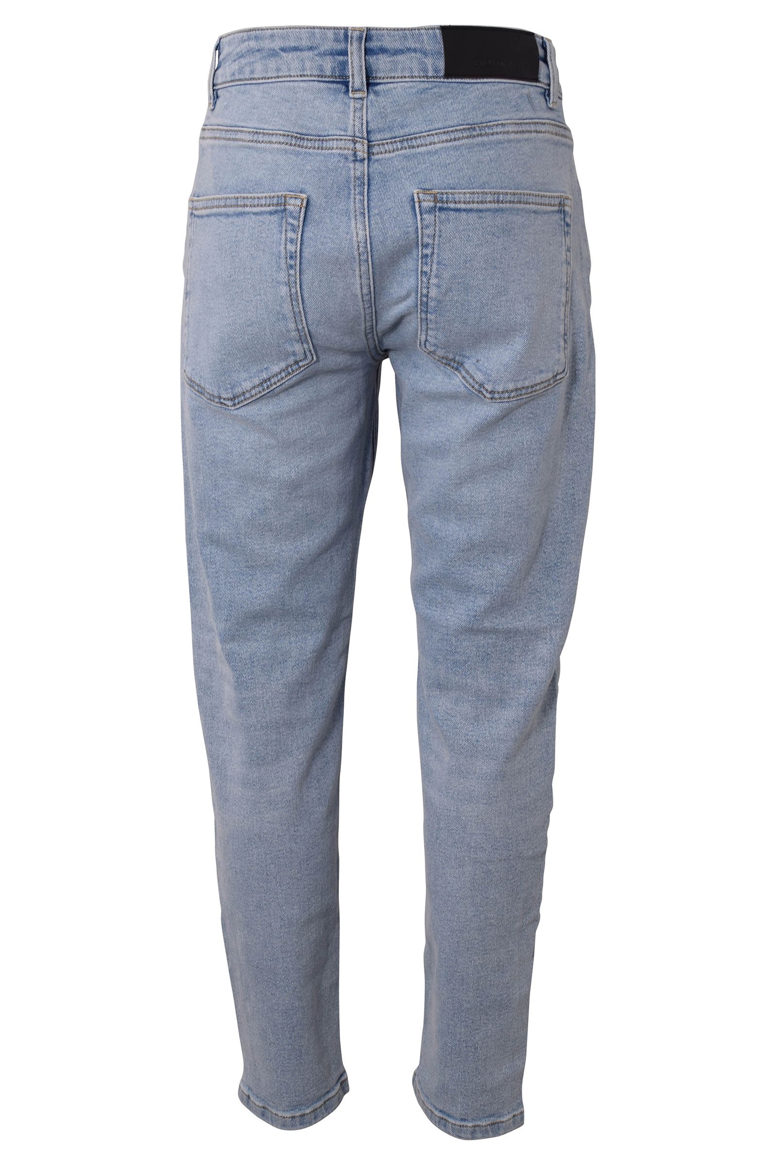 Jeans med 5 lommer i vasket bomuldsdenim med stretch. Gylp med lynlås og knap, samt justerbar elastik inde i linningen. Jeansene har wide fit talje og ben, der bliver smallere forneden, og har god bevægelsesfrihed over lår og knæ.
