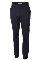 Bukser i blød stretch kvalitet, skrå forlommer og ikke funktionelle paspolerede baglommer. Bukserne har lynlås gylp og knap foran, og justerbar elastik inde i linningen.