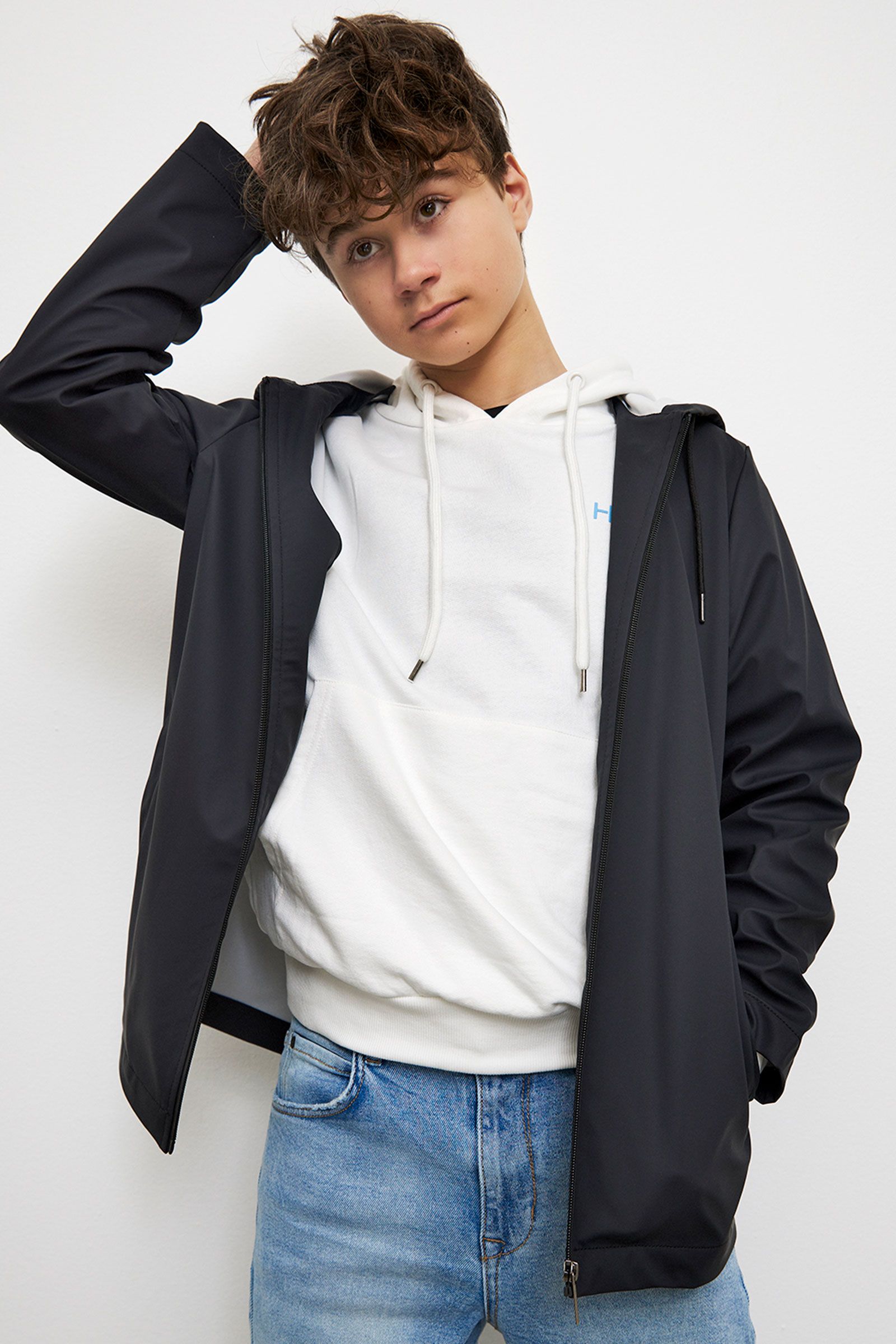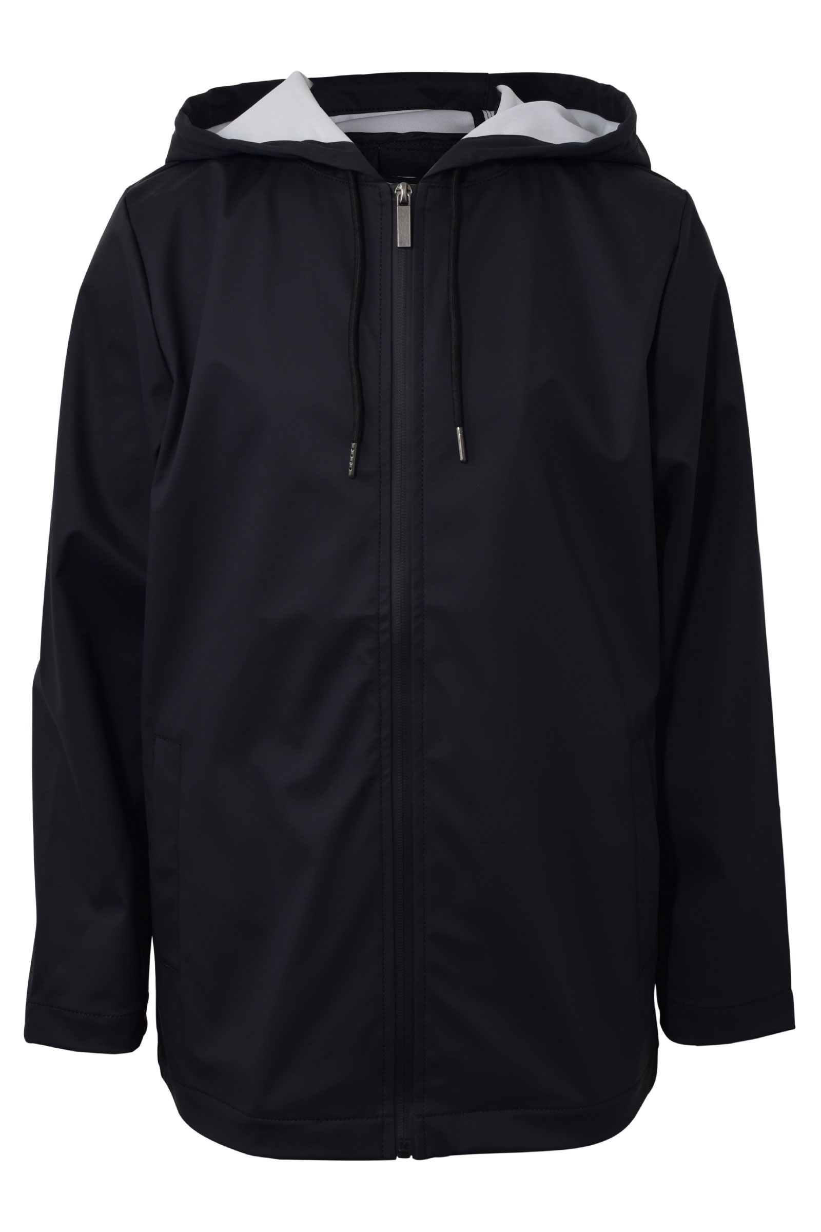 med lommer i siden, hætte med snøre detalje og vandafvisende lynlås lukning fortil.