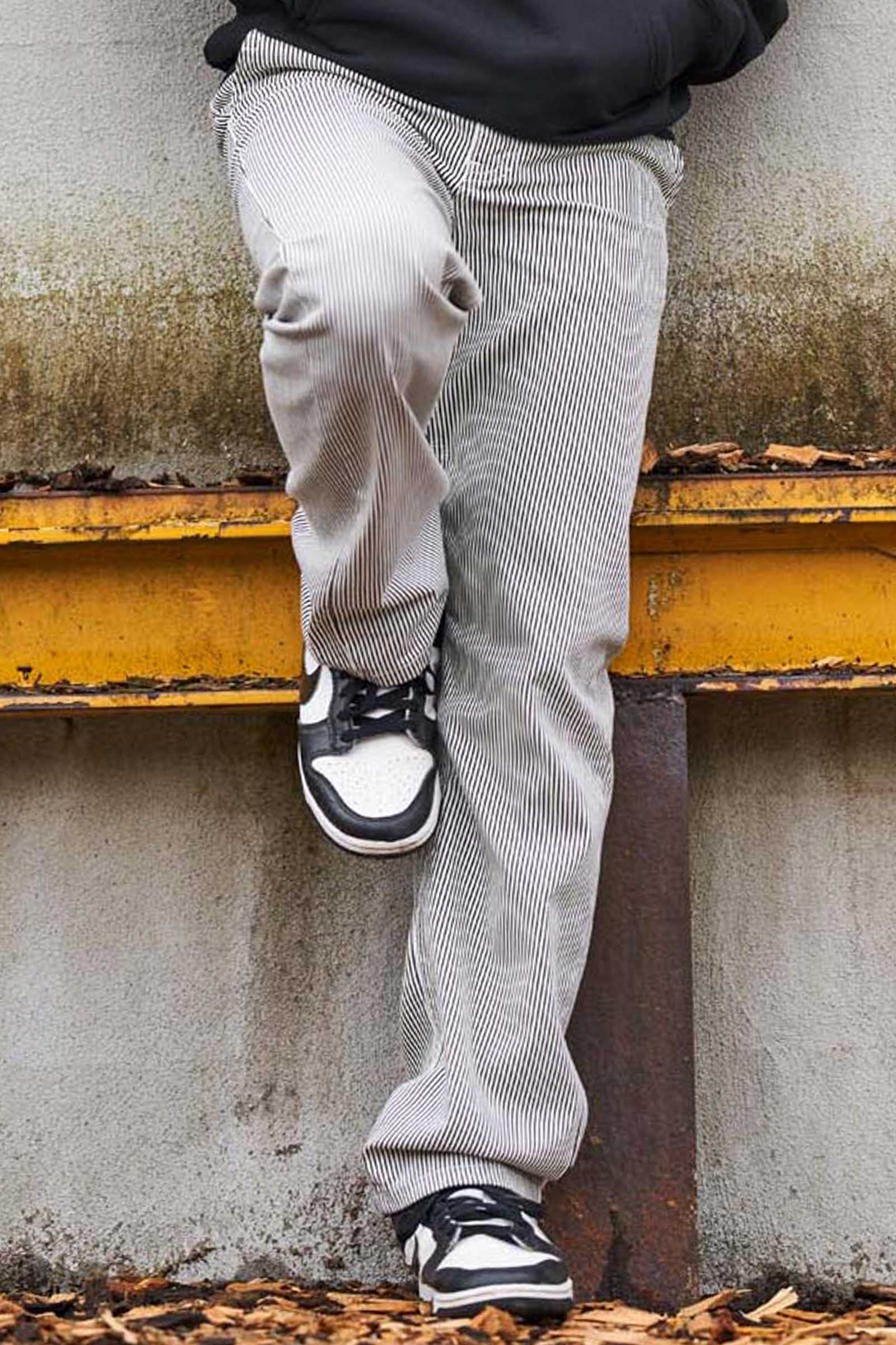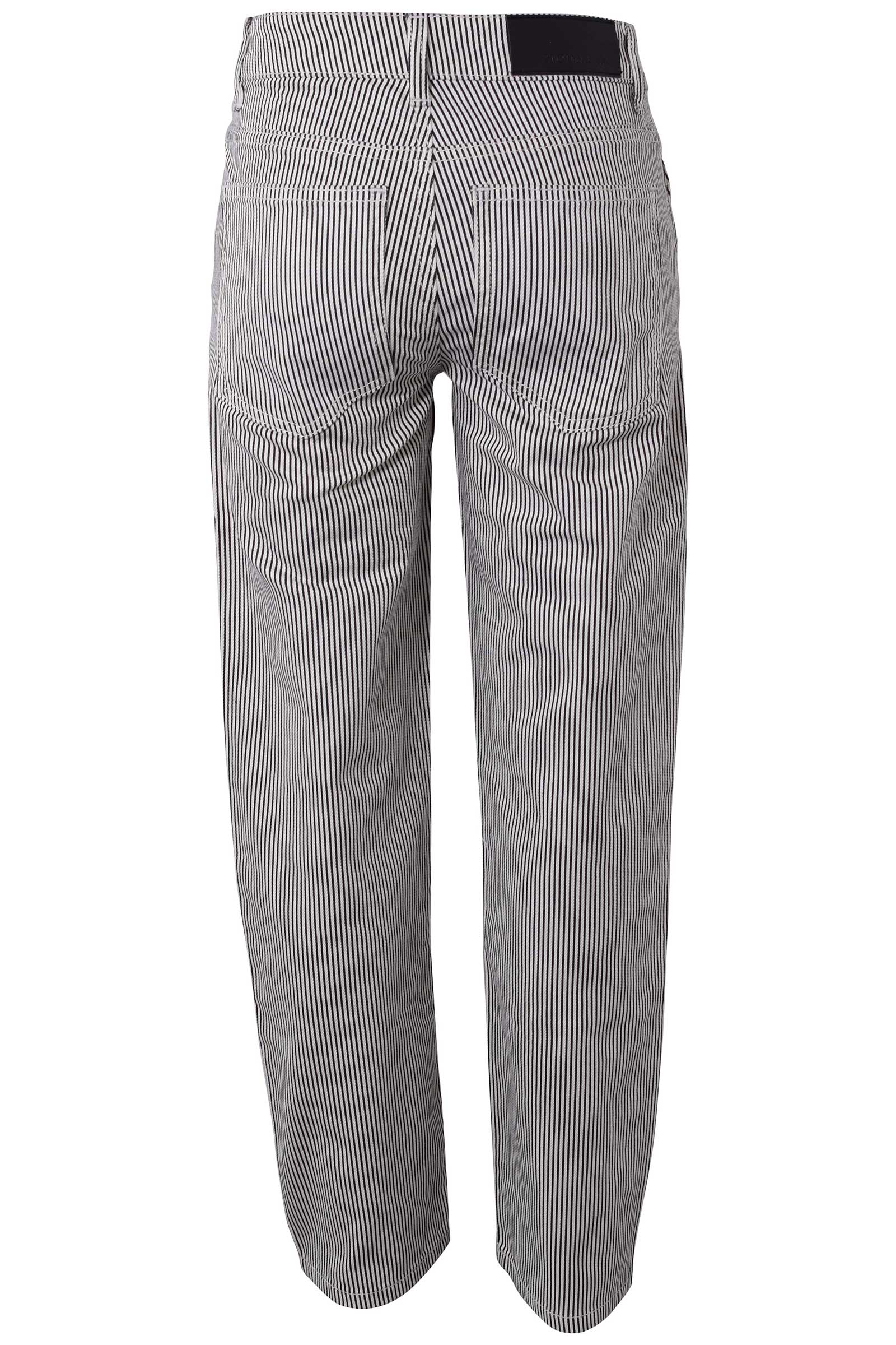 Bukser i stribet mønster med semi vide ben. Bukserne har skrå sidelommer og baglommer. Gylp med lynlås og knap fortil.