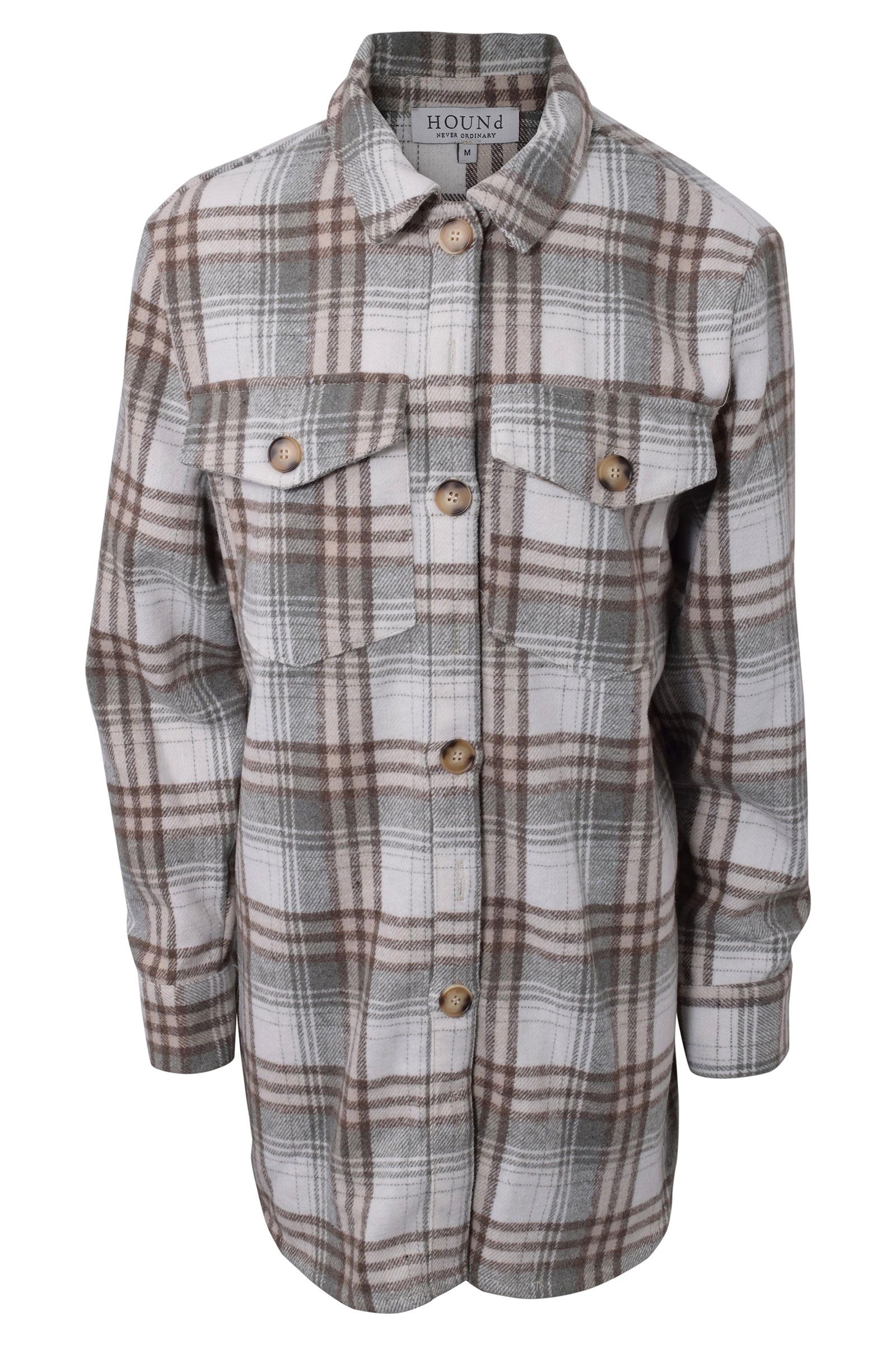 Mega lækker jakke fra HOUNd. Jakken kommer her i et flot gennemført ternet mønster i farverne grå og brun. Jakken kan knappes foran.