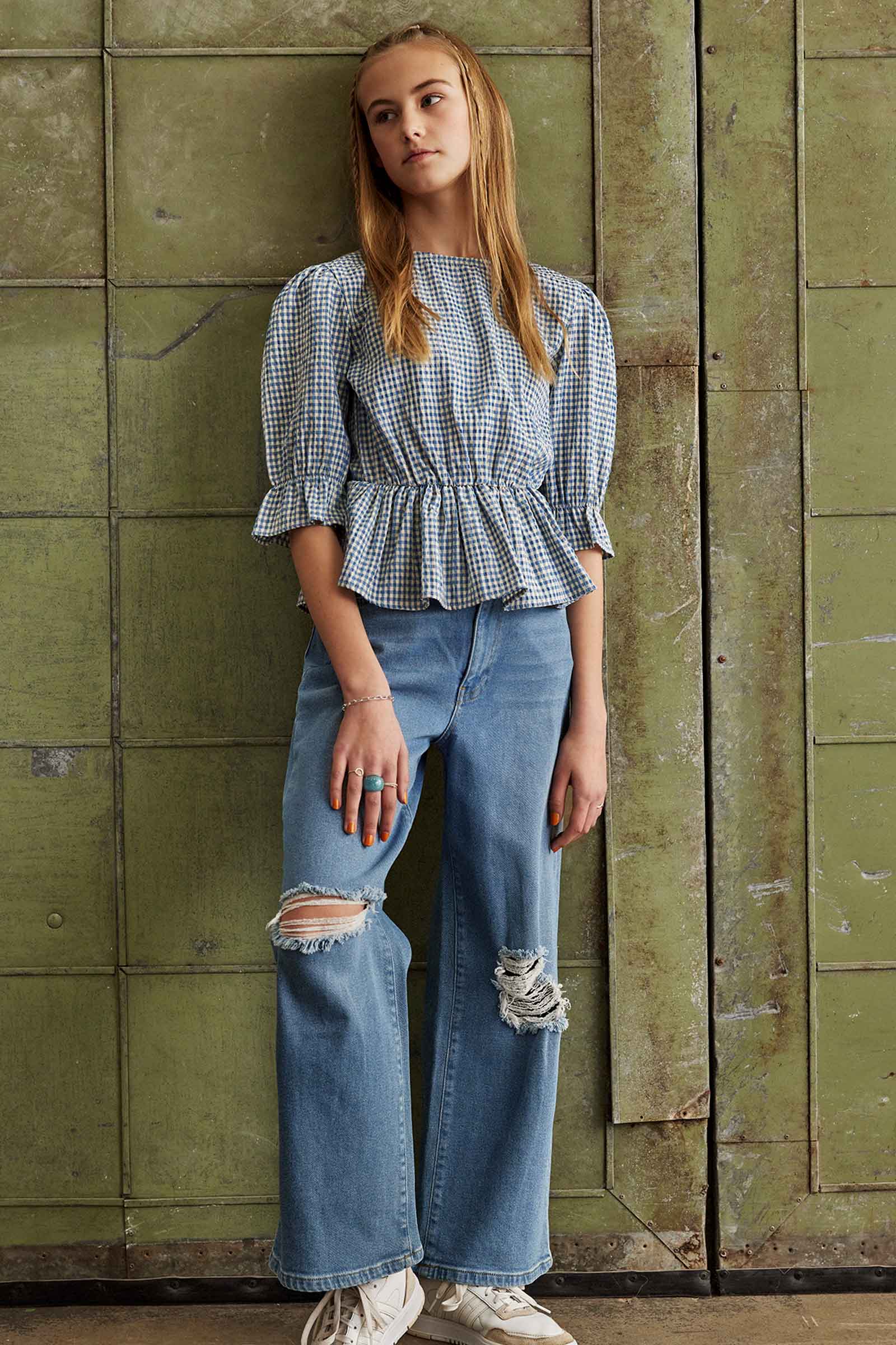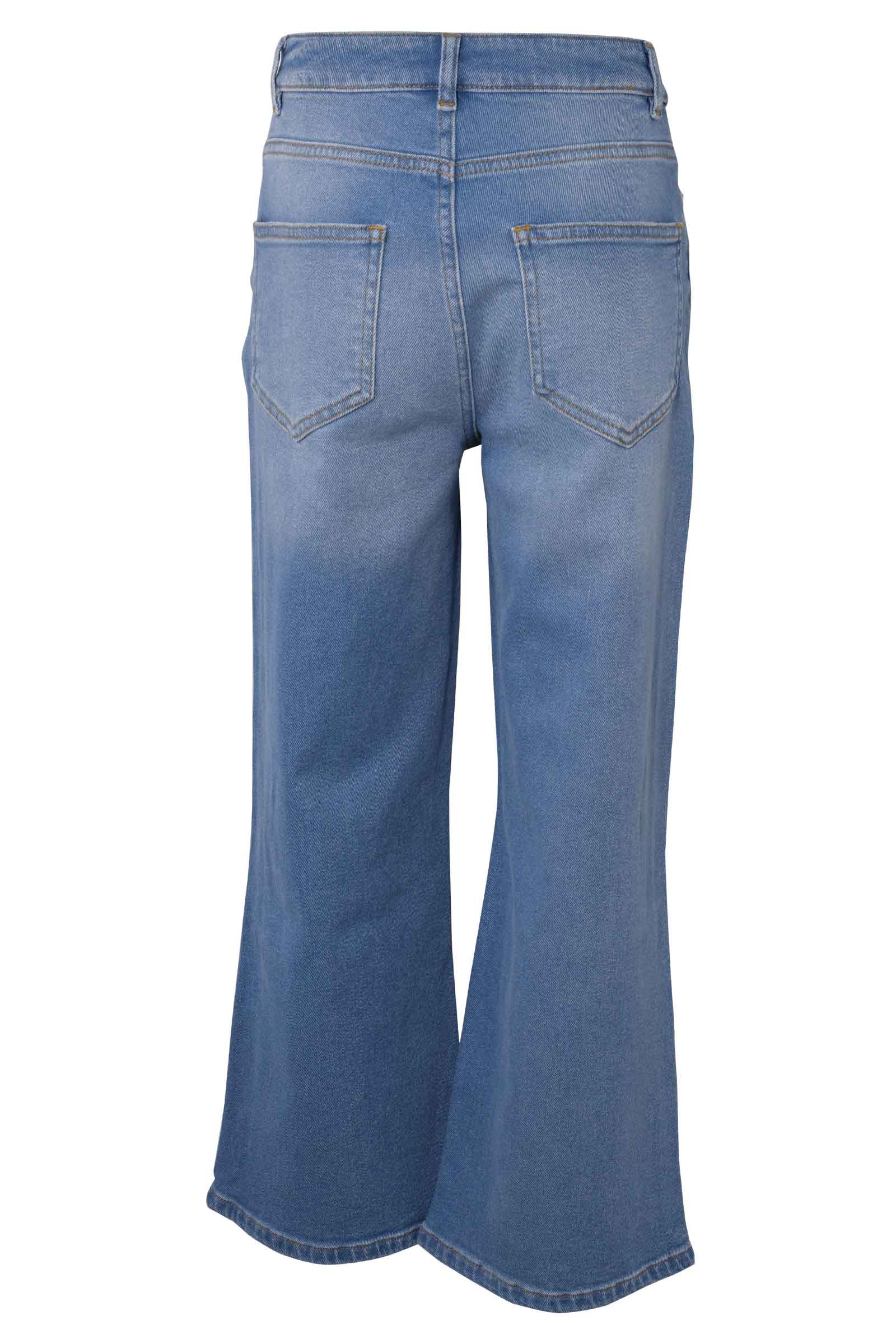 Denim bukser med huller og stretch, vide ben, forlommer og baglommer. Bukserne har lynlås gylp og knap foran, og justerbar elastik i linningen.