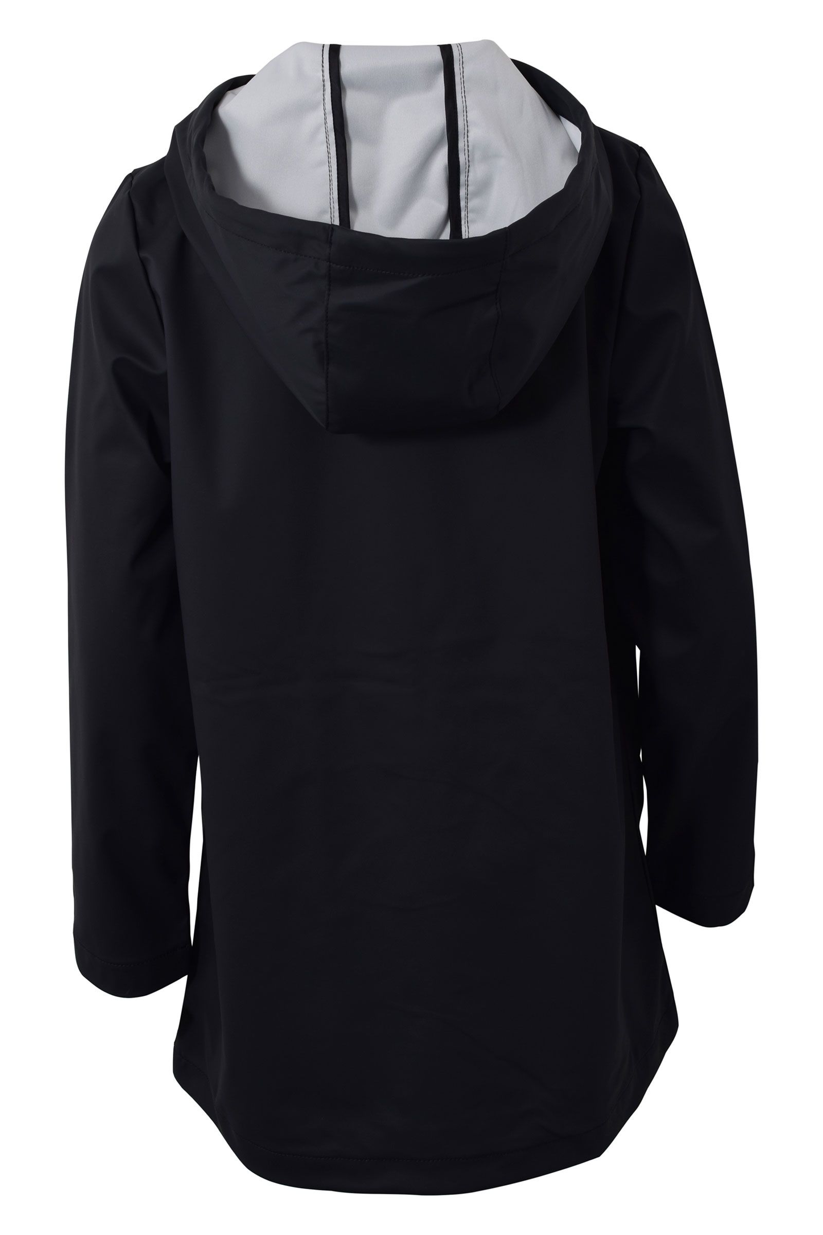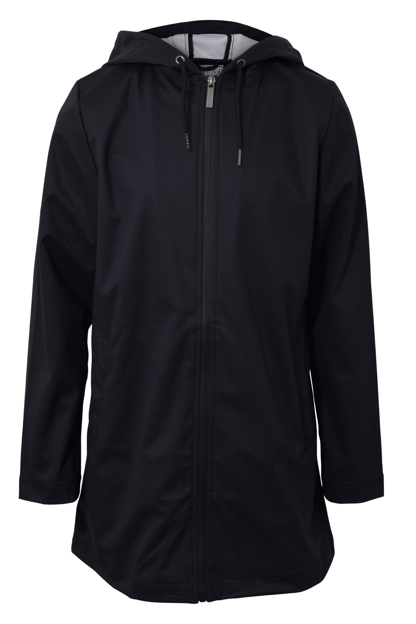med lommer i siden, hætte med snøre detalje og vandafvisende lynlås lukning fortil.