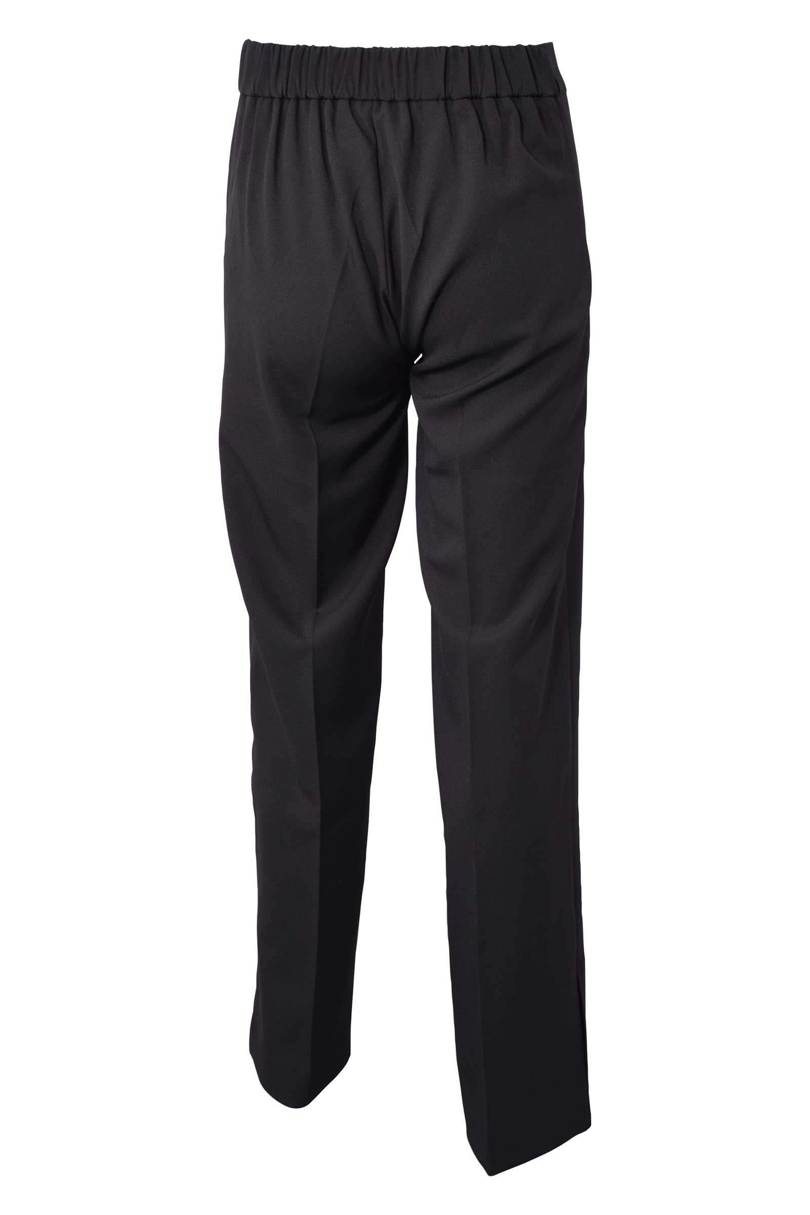 Bukserne med høj talje med elastisk smock bagpå, sidelommer og vide ben. Slid på siderne. Indeholder 93% Polyester 7% Elastan Vask ved 30 grader