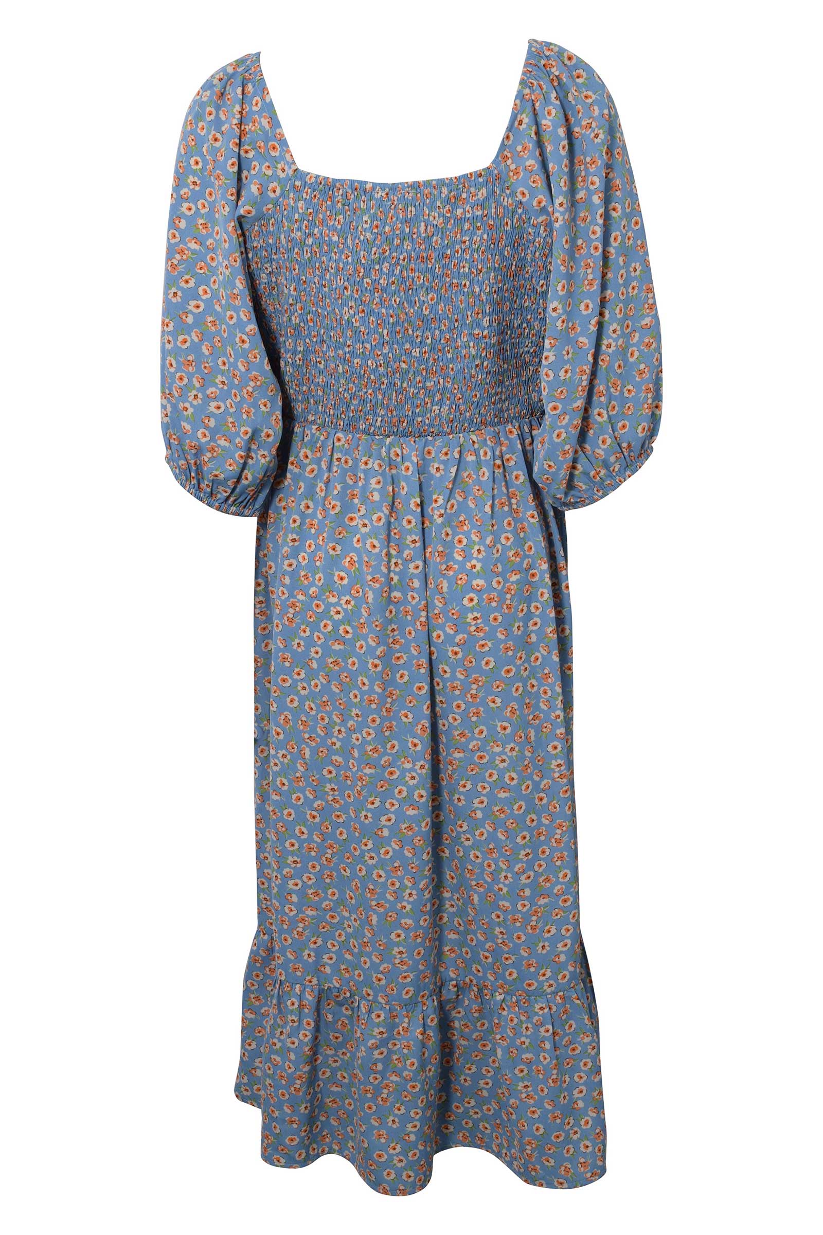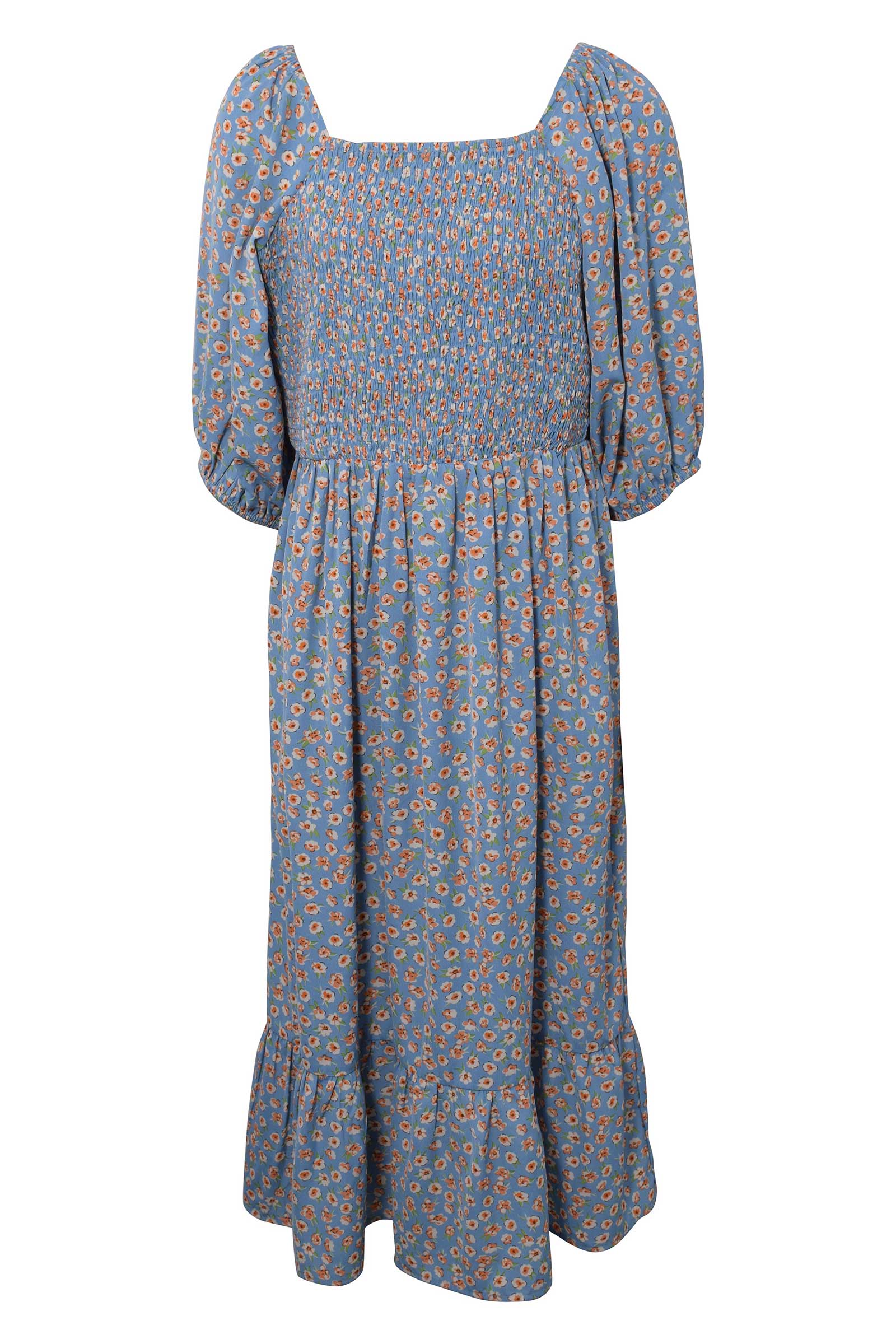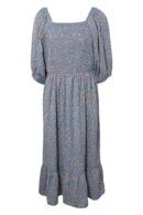 Super sød kjole med korte pufærmer og firkantet udskæring. Skåret i taljen med smock rynkning. Indeholder 100% Polyester - Vask ved 30 grader