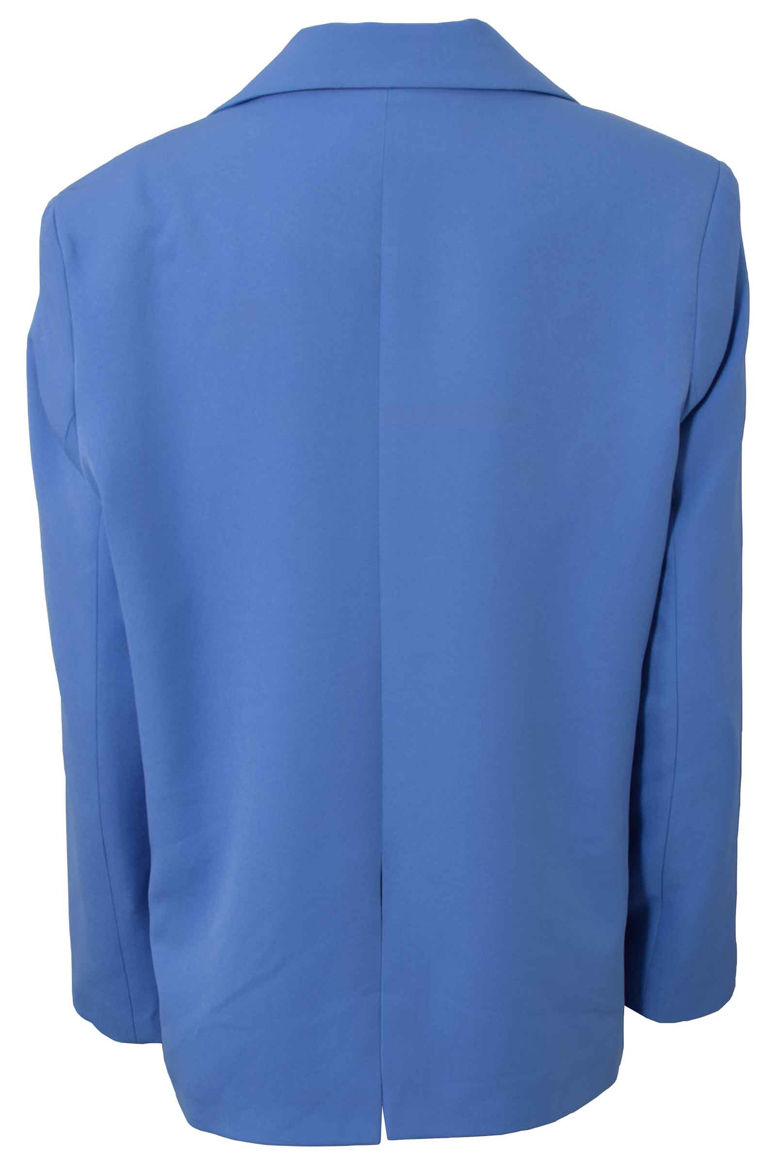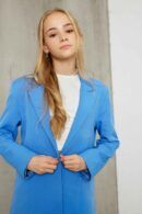 Enkeltrådet blazer i blå med krave og revers samt paspolerede forlommer. Normal pasform. Materiale: 100% Polyester. Vaskeanvisning: Max 30°