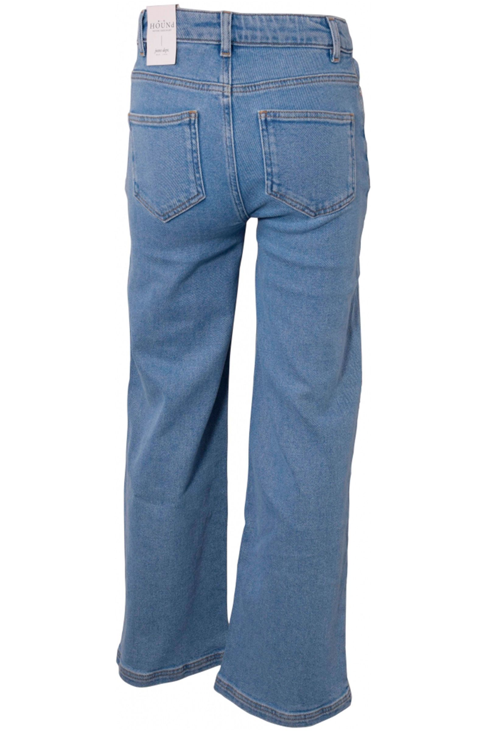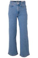 Denim bukser med stretch, vide ben, forlommer og baglommer. Bukserne har lynlås gylp og knap foran, og justerbar elastik i linningen