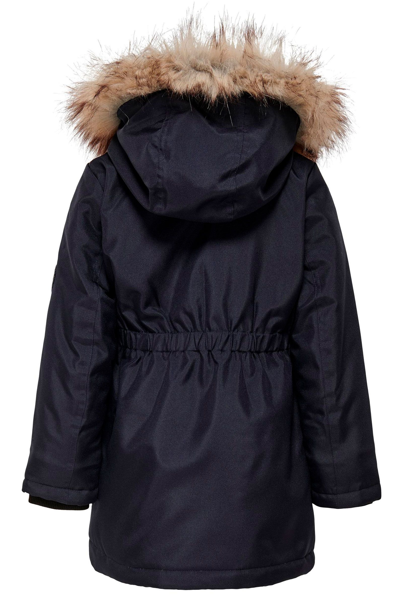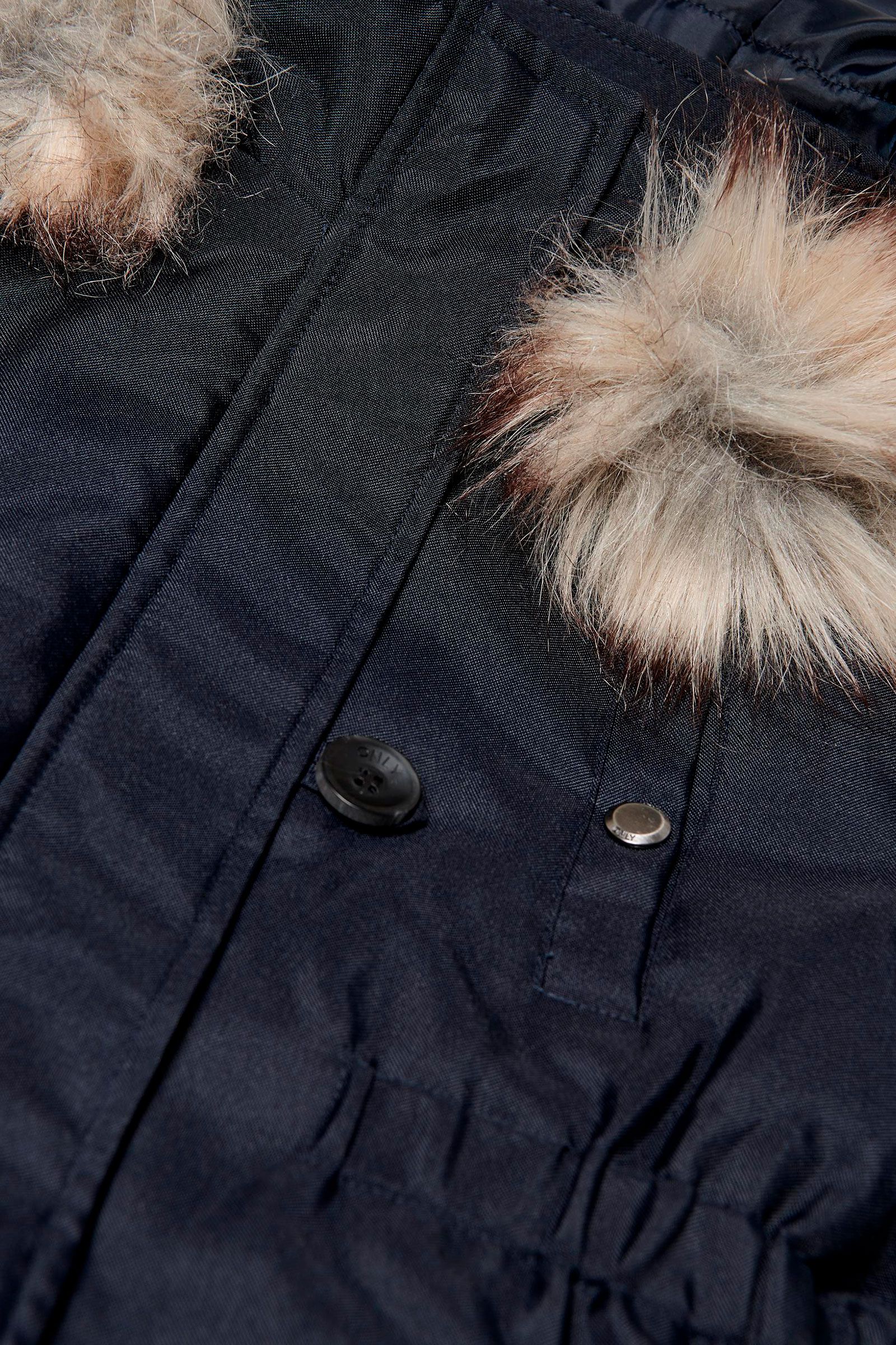 Lækker jakke fra ONLY i fed navy blå farve. Jakken har lommer foran og aftagelig hætte med pels. Elastik i livet.