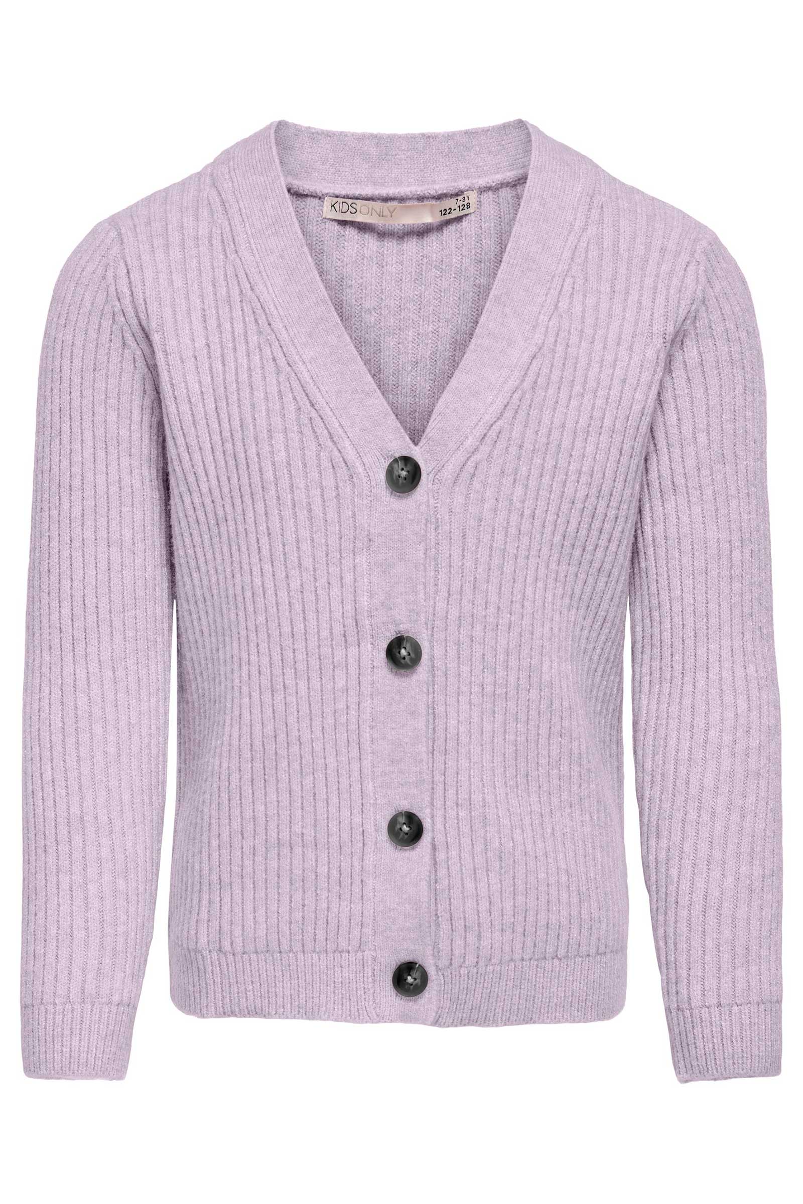 Lækker cardigan i en lys lilla farve fra Only. Cardiganen har v-udskæring og sorte knapper foran. Strikket med rib.