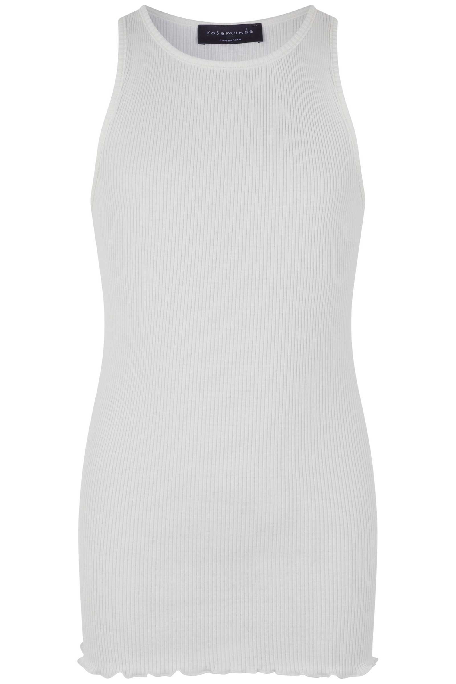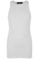Sød Rosemonde top i hvid i en blød ribstikket top med lukket halsudksæring og krølkant nederst.Indeholder 55% silke og 45% bomuld - Vask ved 30 grader
