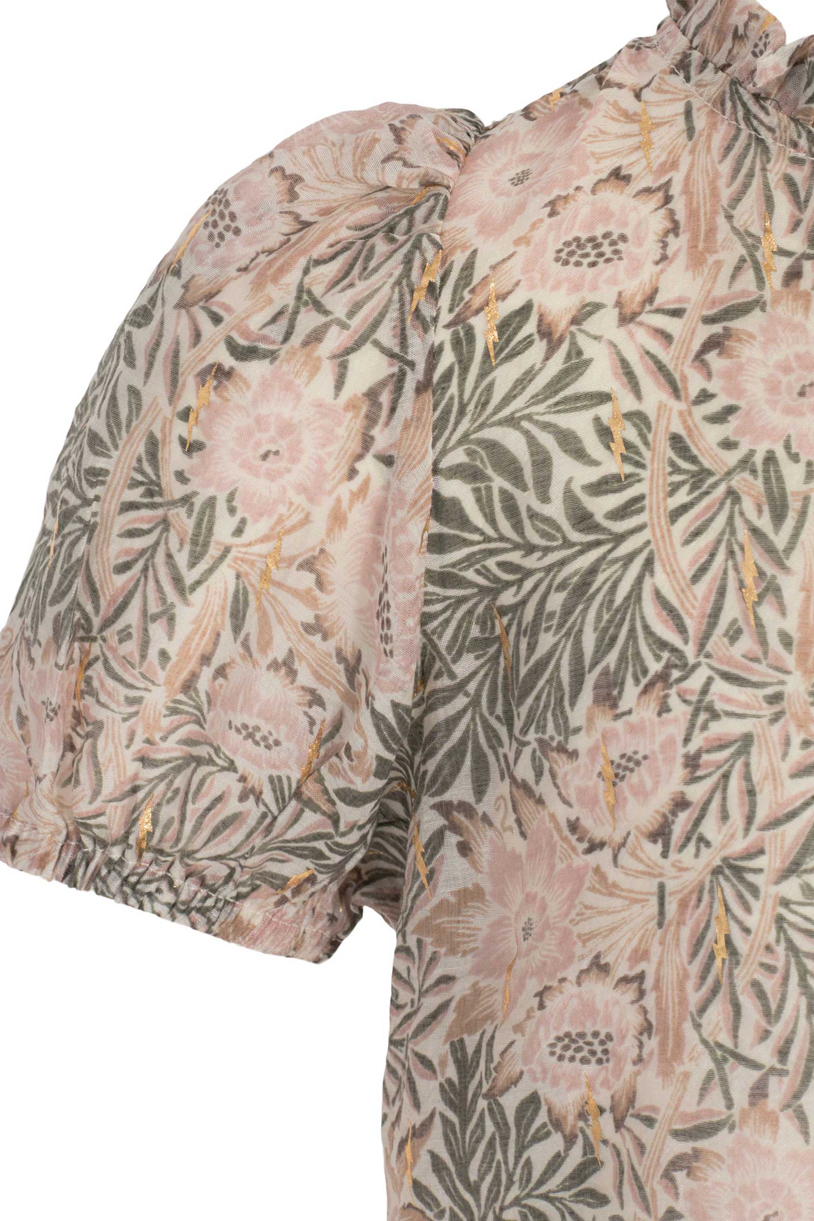 Super sød t-shirt fra SOFIE SCHNOOR, den kommer her i en lækker græs farve med et fint mønster, den har en knap ved hilsen for at lukke.