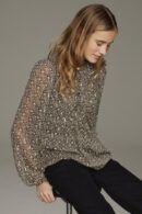Vores elegante mønstrede bluse i sort med lyse blomster og små guld lyn. Blusen har en smal elastikkant for enden af de gennemsigtige ærmer og en høj flæsekant ved halsen. Blusen kan lukkes med fine guld knapper på fronten. Designet er perfekt til et elegant hverdagslook eller en festlig begivenhed