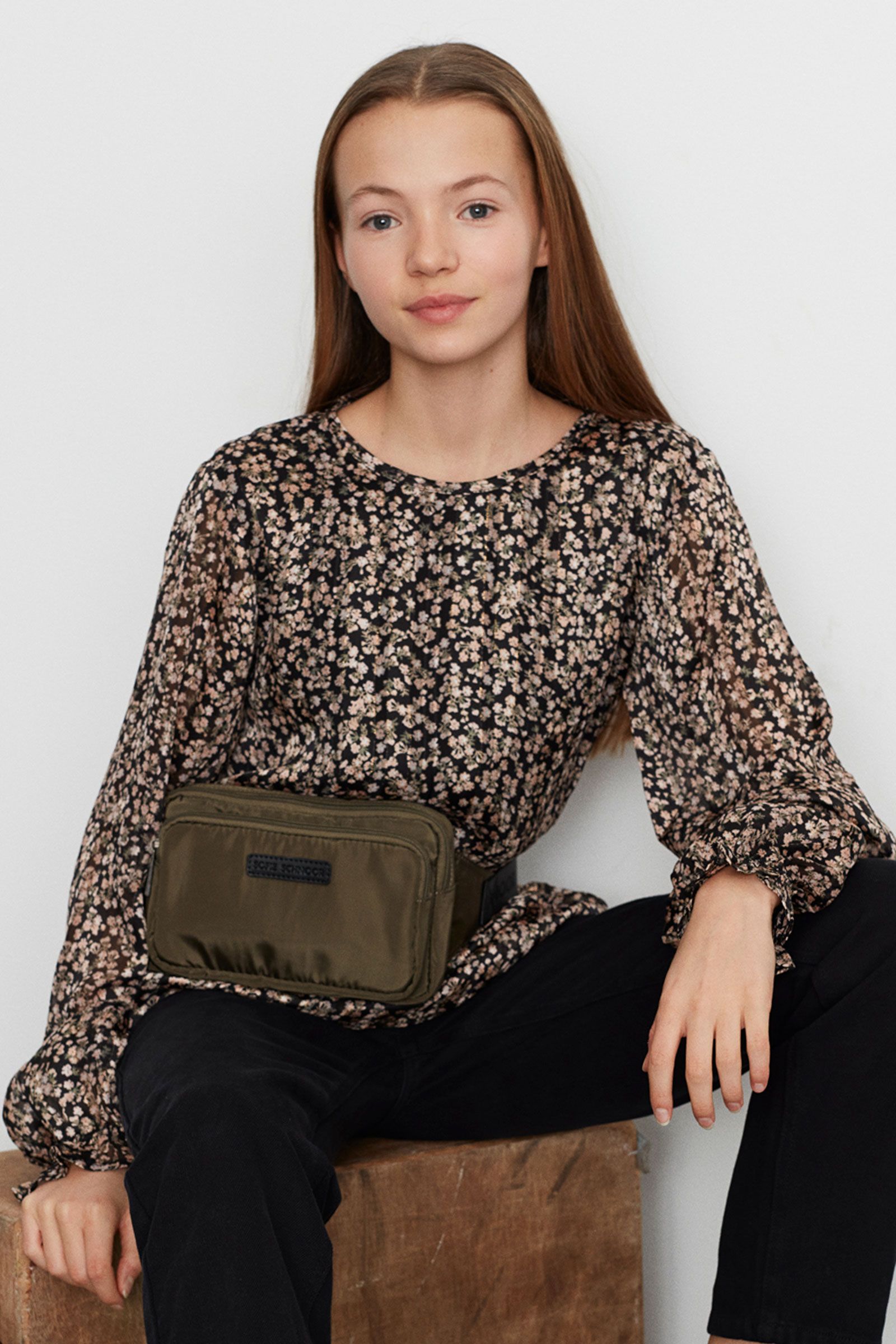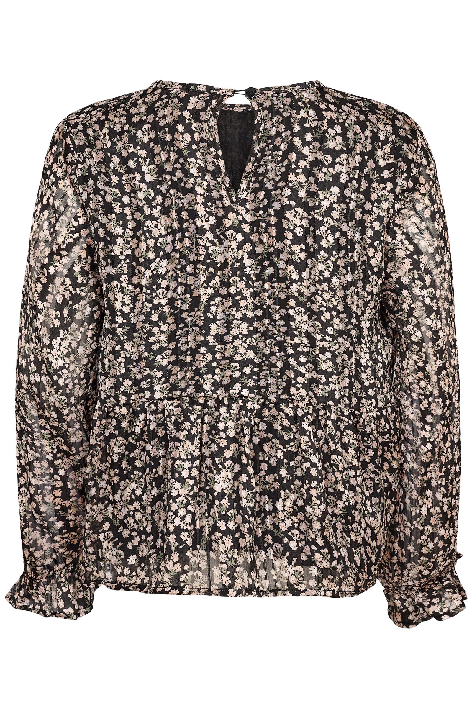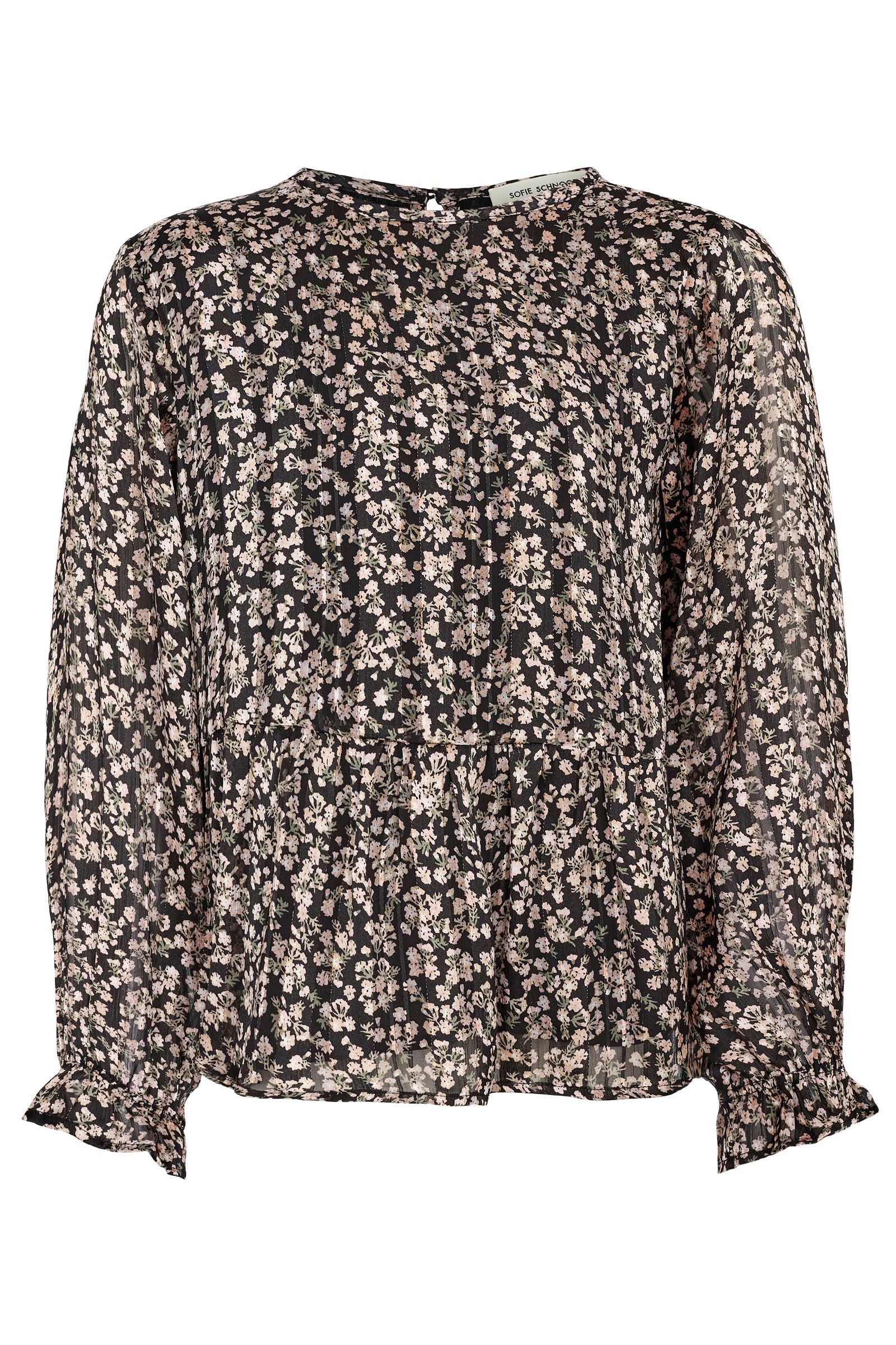 Vores mønstrede skjorte i sort med lyse blomster. Skjorten har elegante flæsekanter ved ærmerne og kan lukkes i nakken med en knap. Et sødt og klassisk efterårslook, der fordelagtigt kan kombineres med sorte bukser
