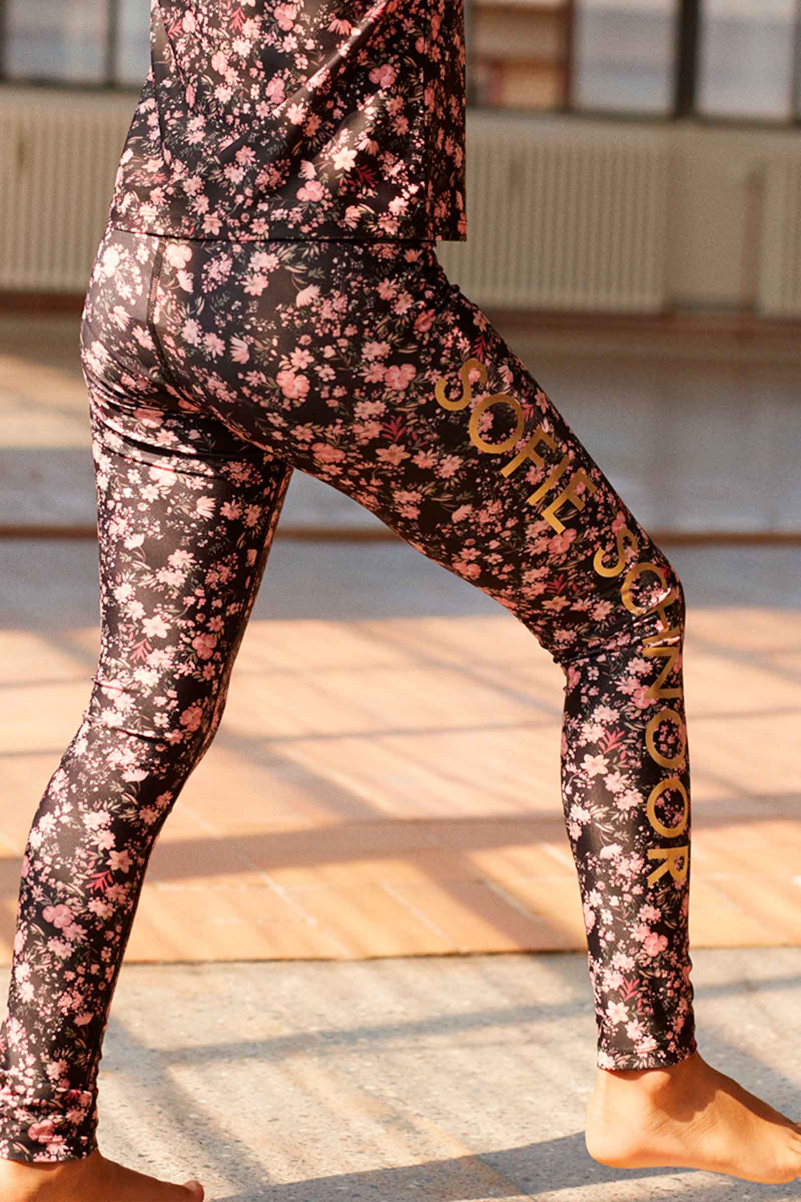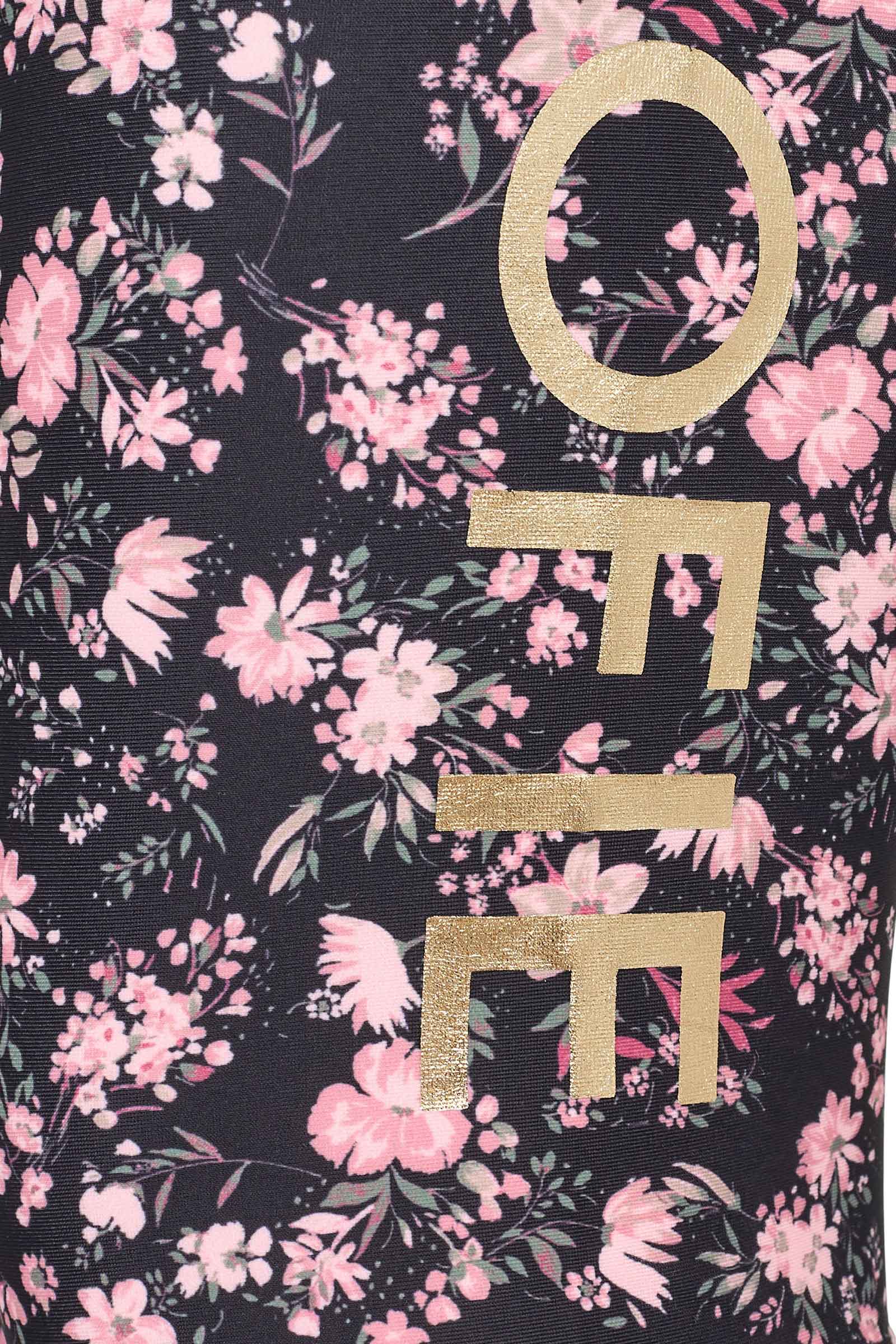 Sofie Schnoor leggings i sort med blomster og guld logo ned af siderne.Iindeholder 80% polyester 20% elastane. Vask ved 30 grader